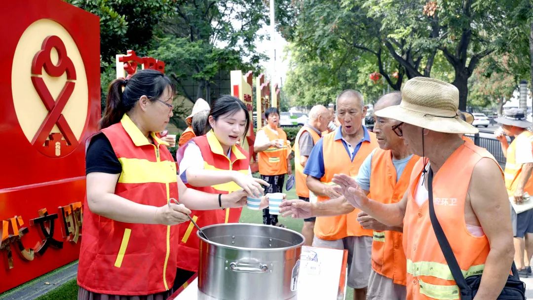 8月17日中午,新安縣稅務(wù)局新時(shí)代文明實(shí)踐分中心前架起小桌板,撐起“愛(ài)心茶水供應(yīng)處”牌子,帶著剛剛熬煮好的綠豆湯,為炎炎夏日仍堅(jiān)守在戶(hù)外的工作者們送去陣陣涼意。志愿者們?yōu)榄h(huán)衛(wèi)工人盛上滿(mǎn)滿(mǎn)一杯綠豆湯,并把采購(gòu)的毛巾、香皂、風(fēng)油精等消暑物品制作成一件件“清涼包”發(fā)到環(huán)衛(wèi)工人的手上,感謝他們對(duì)這座城市的無(wú)私奉獻(xiàn)。